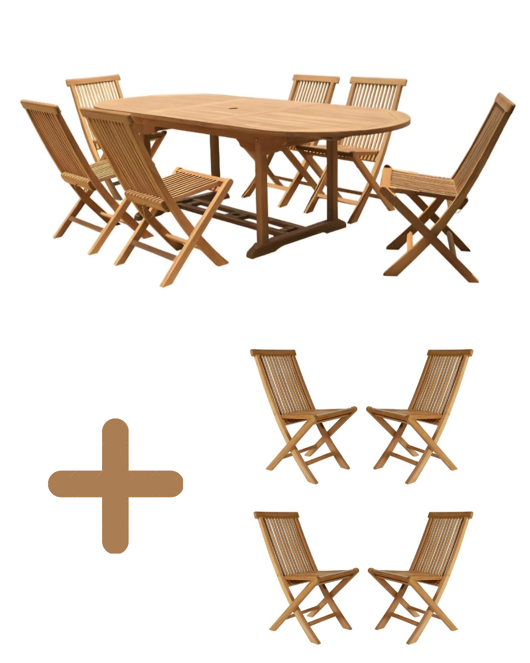 Bel ensemble de jardin en teck – Table ovale extensible 180-240 et 10 chaises pliables en teck