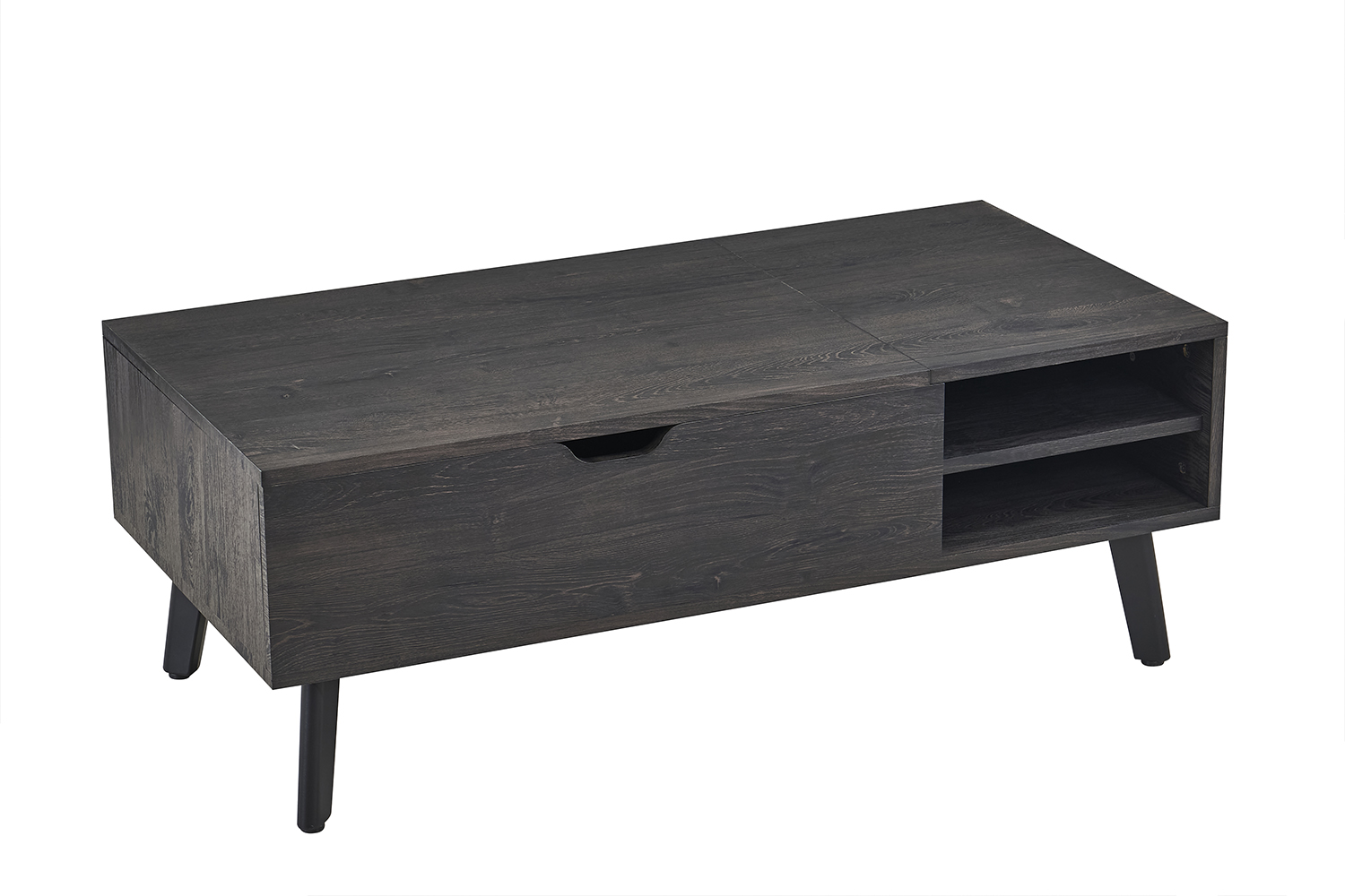 Le plateau de la table est fabriqué en MDF de 18 mm d’épaisseur, revêtu d’un décor papier 3D reproduisant fidèlement la structure naturelle du bois. Cette finition offre une surface lisse, facile à entretenir et simple à nettoyer. Le plateau se compose d’une partie relevable de 80 cm et d’une partie fixe de 40 cm, offrant ainsi un espace de travail ou de repas supplémentaire lorsqu’il est déployé. Le mécanisme de charnière est solide et permet un mouvement fluide lors de l’ouverture et de la fermeture. Sous le plateau relevable se trouve un compartiment de rangement pratique, idéal pour y placer des livres, des télécommandes ou d’autres accessoires. Le piètement est constitué de pieds en acier revêtus d’une laque noire, assurant une structure stable et un design moderne. L’association de l’acier et du MDF rend la table durable, robuste et facile à entretenir.